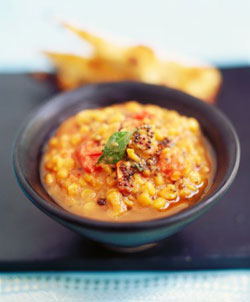 Adăugaţi sarea şi mirodeniile în supă. Dacă doriţi ca supa să aibă un aspect mai lichid, mai adăugaţi încă o cană cu apă. Puneţi apoi supa la fiert pentru încă 2 minute. Se serveşte fierbinte, garnisită cu frunze de coriandru.