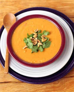Pune trei căni din această supă într-un blender şi pasează-le bine. Pune supa cremă înapoi în oală şi las-o să mai fiarbă puţin. Adăugă zeamă de lămâie. Gustă şi, dacă este nevoie, completează cu sare şi suc de lămâie. Serveşte una dintre cele mai aromate supe de toamnă cu arahide şi coriandru tocat mărunt!