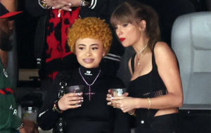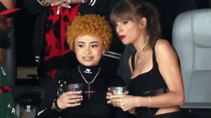 Swift se relaxa vorbind cu Ice Spice, care purta la gât o imensă cruce inversată.