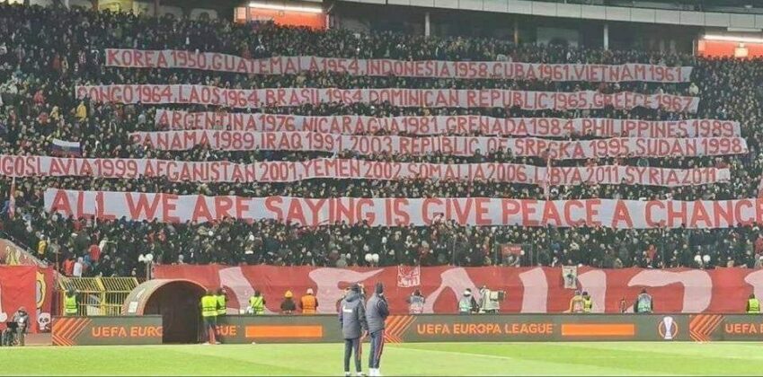Suporterii echipei Steaua Roșie Belgrad au scris pe bannere toate războaiele în care a fost implicată SUA din 1950 încoace, cu mesajul: Dați-i păcii o șansă
