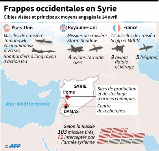 Selon le général Joe Dunford, les forces occidentales ont visé samedi à 1 heure trois cibles liées au programme d’armement chimique syrien, l’une près de Damas et les deux autres dans la région de Homs, dans le centre de la Syrie. Plus de 100 missiles de croisière, ainsi que des bombes guidées laser, ont été lancés. Selon le général Dunford, les alliés ont pris soin d’éviter de toucher les forces russes. Moscou a confirmé qu’aucune frappe n’avait visé les abords de ses bases aérienne et navale situées dans le nord-ouest du pays.