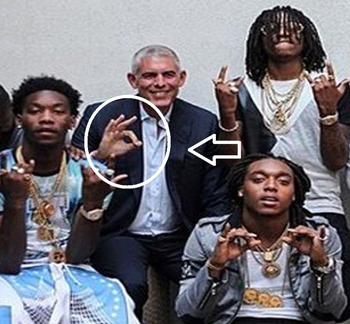 Look closely at the hand sign Lyor is making with the Migos in this photo. This is a sign repeatedly seen in the music industry and in circles of power. Through anecdotal observation we can suspect there is some body of people who throw up this symbol.
