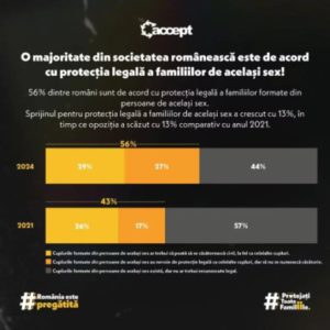 În ciuda discursului descurajator al decidenților politici, statisticile arată că societatea românească este, în 2024, mai pregătită pentru egalitate decât a fost vreodată. Conform datelor publicate în cel mai recent studiu ACCEPT, nivelul de susținere și empatie al românilor față de familiile LGBTQIA+ a crescut considerabil în ultimii ani. O majoritate istorică reprezentată de 56% dintre aceștia sunt de acord cu căsătoria sau cu o altă formă de recunoaștere legală a familiilor formate din persoane de același sex – cu 13 puncte procentuale mai mulți decât în 2021. În plus, 72% dintre români consideră că familiile lor nu ar avea nimic de pierdut dacă familiile same sex ar avea drepturi egale”, se arată în comunicatul ACCEPT.