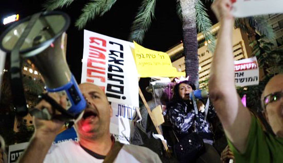 Haaretz.com reports that demonstrators on Tel Aviv’s Rotschild Boulevard held signs reading: “Out with the corrupt!” and “Not leftist, not rightist, but honest!” or “Being a pig isn’t kosher” and “Bibi [nickname of Benjamin Netanyahu] go home”.