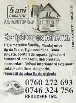 În urmă cu câteva săptămâni, mergând la cursul de yoga, doamna Z.C. a remarcat la avizierul de la sala Pipera un anunţ prin care o aşa-zisă „Echipă cu experienţă” îşi făcea reclamă pentru efectuarea a diferite servicii în domeniul construcţiilor, în special legate de izolaţii termice şi manoperă cu accesorii din tablă. În anunţ se menţiona că se oferă cinci ani garanţie a lucrărilor, reduceri de 15% din costuri şi… seriozitate.