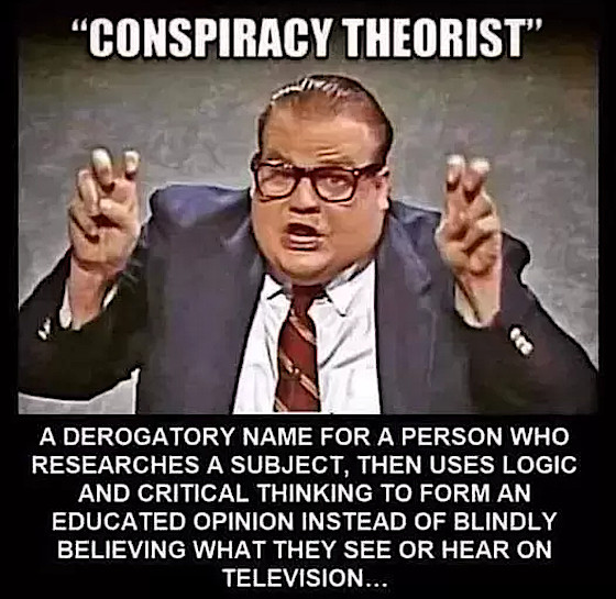 (Traducere: Teoretician al conspirației – Un denumire depreciativă pentru o persoană care cercetează un subiect, apoi folosește logica și gândirea critică pentru a-și forma o opinie educată, în loc să creadă orbește ceea ce vede sau aude la televizor…)