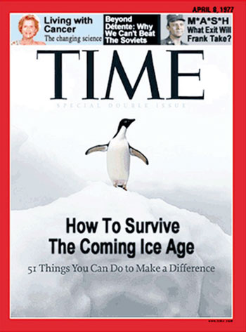 Here’s the cover of TIME Magazine from 1977, which warns, “How To Survive The Coming Ice Age,” then urges readers to get on board to save the planet, saying, “51 Things You Can Do to Make a Difference.”