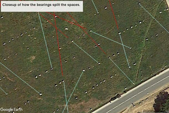 This image illustrates the difference between a normal geoglyph and the Carnac geoglyphs. Normally a bearing is derived from running a line between two independent rocks or points. In this case the puzzle can only be solved by finding the two rocks which will inscribe a line through the center of the spaces.