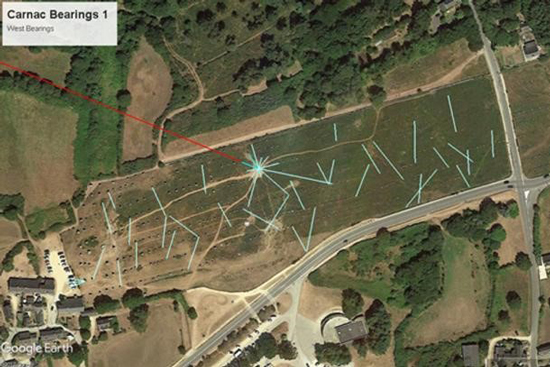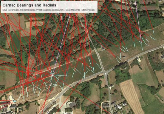 While hundreds of conventional geoglyphs have been located and surveyed around the world, Carnac is in a class of its own. While Carnac uses the same protocols as other geoglyphs, the way they are applied are unique to the Carnac stones. While most geoglyphic surveys are done by running lines through, or parallel to tangible objects, Carnac requires that these principles be applied to the spaces between the stones rather than the stones themselves. As you see in the following image, the puzzle is solved by running lines through the center of the spaces between the stones in order to decode the puzzle. There is only one pair of stones that, when a line is drawn between them, will position the line directly in the center of the space. Once these lines are determined the rest of the survey continues just as in other territorial geoglyphs.