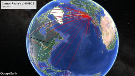 In the previous image there are two magenta colored radials (radials being extensions of the bearings.). The west radial points to Edinburgh, Scotland and the East Magenta line points to Stonehenge. Since both endpoints are historically related to the Celts one would have to assume that the Celtic culture had its roots somewhere before 3400BC. One would also have to assume that these ancient cultures had a detailed knowledge of the earth long before history tells us.