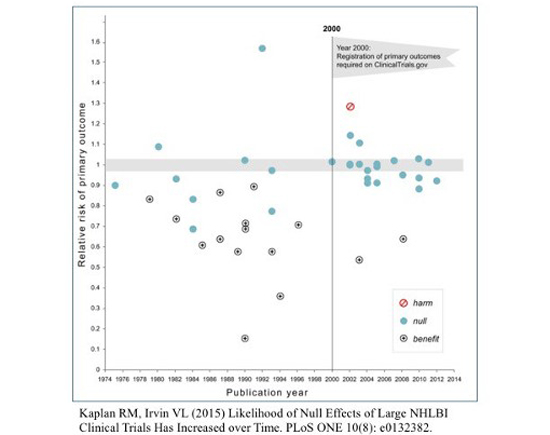 Or consider the example of registration of primary outcomes. Prior to year 2000, companies doing trials did not need to declare what end points they measured. So they measure many different endpoints and simply figured out which one looked best and then declared the trial a success. Kind of like tossing a coin, looking at which one come up more, and saying that they were backing the winning side. If you measured enough outcomes, something was bound to come up positive.