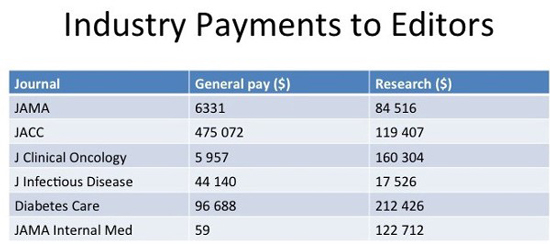 This is slightly horrifying. Each editor of the Journal of the American College of Cardiology received, on average, $475.072 personally and another $119.407 for “research”. With 35 editors, that’s about $15 million in bribes to doctors. No wonder the JACC loves drugs and devices. It pays the private school bills. More money = we’ll publish your crooked studies for your benefit.