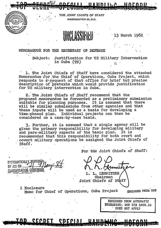 Consider that Joint Chiefs of Staff in the Northwoods document requested authorization to conduct false flag terror operations in the U.S. in order to justify an invasion of Cuba. Only JFK’s fateful refusal to comply stopped those proposed Gladio-style false flag operations from occurring on U.S. soil.
