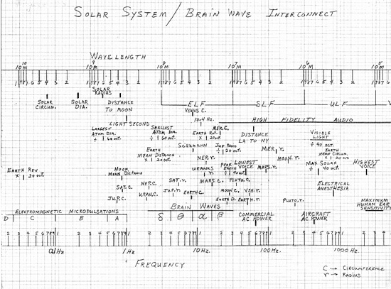 When calculations are performed related to the solar system and the planets, it is found that all of the planets and most of their moons have frequency aspects which fall within our brainwave spectrum. All of the planetary systems have electromagnetic field structures and prominent magnetospheric frequencies. Our home solar system forms a complex, harmonically interrelating, multi-octave musical instrument composed of over forty octaves of vibrational interplay. Your brain/body structure resonates to those continually fluctuating field patterns as they beat against the Earth’s, Moon’s, and Sun’s natural rhythms.