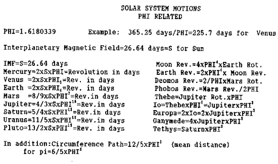 This vast array of solar system matrices is in constant flux as the various motion aspects phase in and out of resonance within the interplanetary magnetic field. Well known cyclical motions present harmonic relationships: the solar day cycle resonates with the alpha spectrum Earth frequency, the 11 year Sunspot cycle harmonizes with a Jupiter-Saturn frequency beating; planetary-coupled Moon motions are harmonically resonating with the Earth’s motions. The basic planetary revolution time cycles form a mathematical design like the growth pattern of the sunflower blossom. All of these modulate the Earth’s rhythms and by so doing send to us their music.