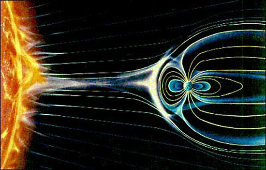 The plasma of the solar wind impinging on the earth’s magnetic field cannot penetrate directly into the earth’s atmosphere. It by-passes the geomagnetic field and creates a cavity, where, the solar wind has direct access to the magnetosphere. The solar wind also stretches the geomagnetic field out into a long magnetic tail on the downward night time side, several hundred Earth radii long.