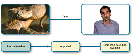 This theory argues that first comes a stimulus, then a cognitive evaluation of the stimulus, and after that a simultaneous experience that consists of the physiological response and the emotion. For example, if you find a bear in the forest, your first thought might be that you’re in grave danger. This leads to the emotional experience of fear and the physical reactions associated with fight or flight.