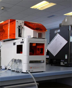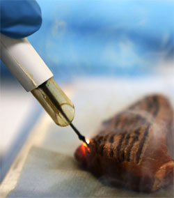 The knife Takats developed is mounted with a laser, which vaporizes molecules. The resulting smoke is sucked into a mass spectrometer for analysis. Electrons are fired at the smoke to disintegrate the molecules, allowing the machine to sort the atoms based on their charge, which is specific to each type.