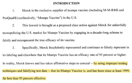 As you can see from the suit, the former Merck scientists claim that “by using improper testing techniques and falsifying test data,” Merck is concealing the fact that the company knows specifically that its mumps vaccine is “far less than” the 95 percent effectiveness the company claims.