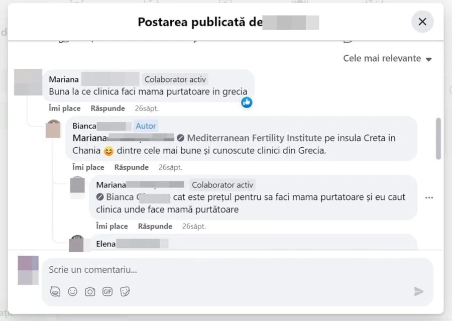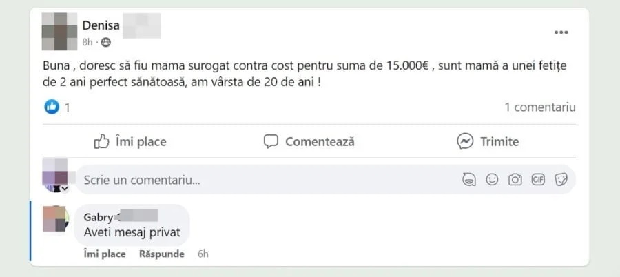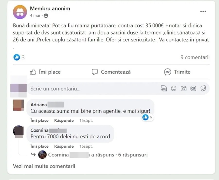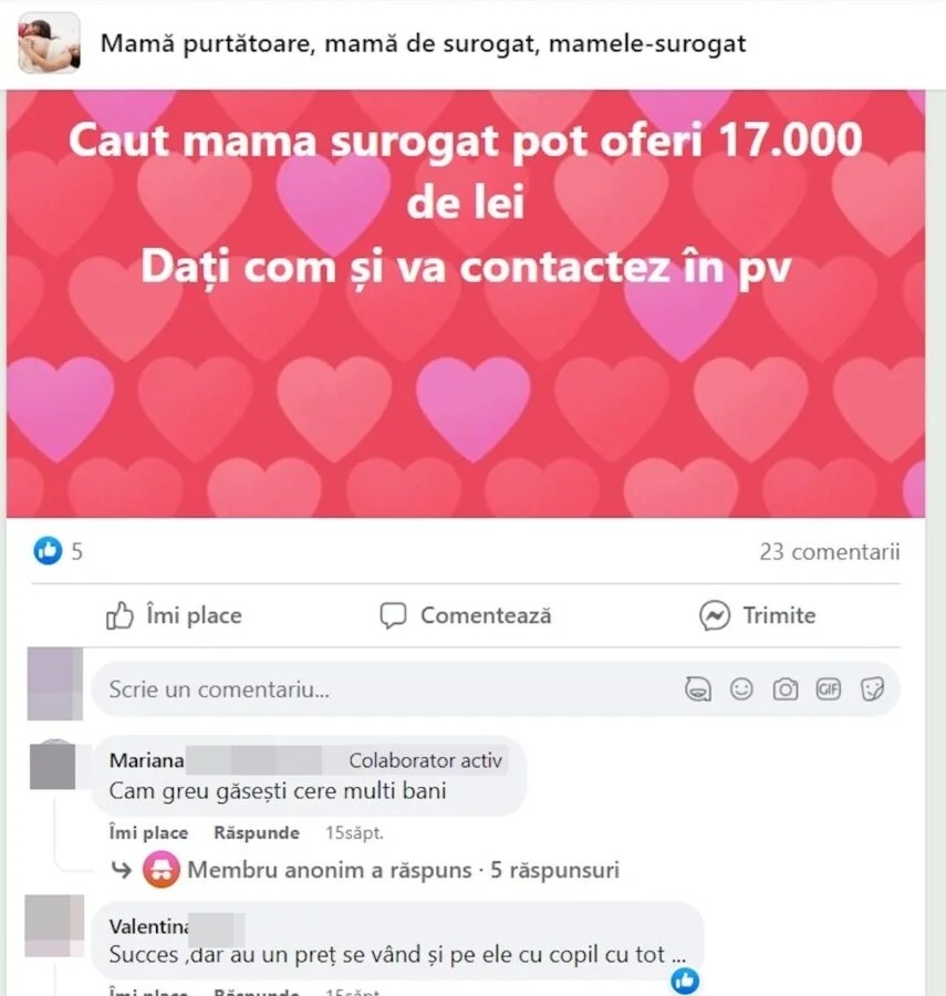 Cauți o mamă surogat? Ai nevoie de spermă sau ovule de la donator? Vrei să devii mamă surogat sau donator? Cauți informații despre adopție? Luați în considerare tratamentul de fertilitate în Ucraina sau Europa? Bun venit în grupul nostru, unde căutăm posibile soluții!”, este mesajul postat în descrierea grupului de Facebook „Mamă purtătoare, mamă de surogat, mamele-surogat”, care are deja peste 600 de membri.