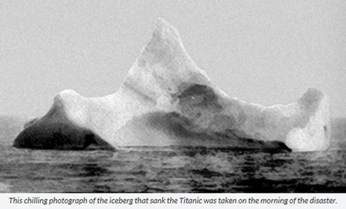 Plus, you have to compare that iceberg to the stories we have been told about the hit. We have many survivor stories, you know. We are told some passengers felt the hit and others didn’t. They were asleep and slept through it. So we are led to believe it was a glancing blow by a submerged iceberg, with the ship just passing over it and being ripped into. If the ship had hit an iceberg much larger than it, as hitting a wall, no one would have slept through it, no one would have survived, and no stories would have been told. If you stop a 50,000 ton object cold from 25mph, the devastation would be enormous, both on the ship and on the iceberg. The iceberg would have pieces of ship buried in for many feet, and other parts would have exploded all over the front of the iceberg. So that photo is just proof the story is false and that we are looking at a huge fake.