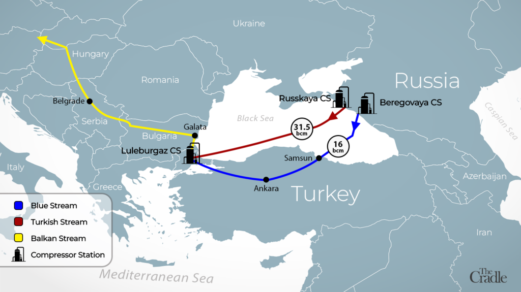 Gazul rusesc circulă prin intermediul conductelor TurkStream și Blue Stream. Capacitatea totală a conductelor rusești este de 39 de miliarde de metri cubi pe an.