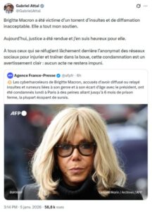 S-a utilizat astfel în mod perfect indirect hărțuirea morală și versiunea sa cibernetică, care constituie o infracțiune din momentul în care se aduc dovezi materiale că a cauzat un prejudiciu moral și/sau material real. Or, din câte știm, Brigitte Macron a refuzat să se supună expertizei psihologice obligatorii care permite stabilirea prejudiciului moral. Doar fiica sa, Tiphaine Auzière, a venit să se plângă la bară. Prejudiciul material nu poate fi stabilit, deoarece Brigitte Macron nu poate obține legal remunerație pentru o funcție care nu există – cu excepția cazului în care se face vinovată de deturnare de fonduri publice.