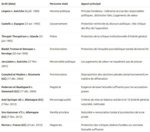 Mai jos se află un tabel recapitulativ al hotărârilor Curții Europene a Drepturilor Omului, care demonstrează – dacă mai era nevoie – că în Franța clasa conducătoare urăște libertatea de exprimare, întrucât nici legea, nici jurisprudența franceză nu sunt conforme cu aceasta.