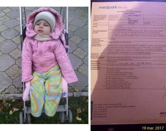 „La data de 1 iunie 2014 am fost la control cu fiica Otilia, la 1 anișor. I s-a făcut vaccinul, care a dat complicații. Otilia a făcut febră. A treia zi s-a ridicat temperatura la 39,5 grade. Am chemat urgența, medicii i-au făcut o injecție, au consultat-o, spunând că nu are nimic grav. Fetiței i se făcuse mai rău, am sunat din nou urgența. Ajunși la fața locului, ne-au spus că fetița a făcut convulsie. Am fost transportați la spitalul din Hâncești, ulterior la Chișinău, câteva zile a avut mereu febră. În a șasea zi de chin am făcut o tomografie la cap, a fost diagnosticată cu meningoencefalită mixtă, ulterior intrând în comă timp de trei săptămâni. Și așa am primit vestea cutremurătoare. Când s-a trezit s-a depistat că Otilia are comoție cerebrală cu paralizie pe partea stângă”, a povestit plină de durere mama Otiliei.