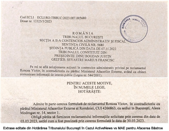 Iertători din fire, am așteptat un răstimp de la data comunicării Hotărârii pentru a ni se transmite răspunsurile solicitate încă de acum aproape un an, în martie 2023. Am crezut degeaba în posibila pocăință a unor trădători patentați. Răspunsurile politrucilor din MAE n-au venit nici până azi, după o lună de zile, ceea ce ne obligă să-i facem de râs chiar cu Hotărârea Instanței, care vorbește de la sine. Mulțumim pe această cale magistraților care ne-au dat dreptate!