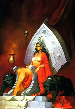 Chamunda, cea unsă cu sânge, împodobită cu ghirlande de cranii umane,