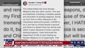 „Statele Unite au mai multe arme nucleare decât orice altă țară. Acest obiectiv a fost realizat inclusiv printr-o actualizare și renovare completă a armelor existente, în timpul primului meu mandat. Din cauza puterii lor distructive uriașe, am urât să fac asta, dar nu am avut de ales! Rusia este pe locul al doilea, iar China este la mare distanță, dar va ajunge la același nivel în cinci ani. Din cauza programelor de testare ale altor țări, am instruit Departamentul de Război să înceapă testarea armelor noastre nucleare pe o bază egală. Acest proces va începe imediat. Vă mulțumesc pentru atenția acordată acestei chestiuni! Președintele Donald J. Trump”
