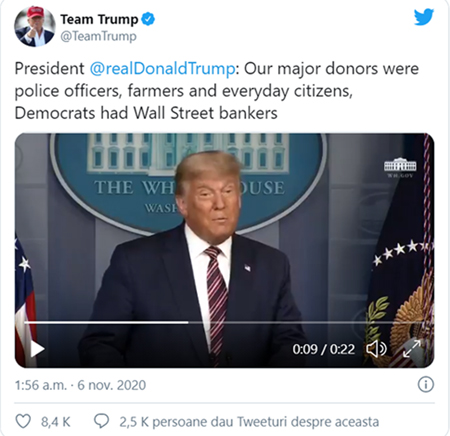 Într-o conferință de presă despre situația din alegeri, Trump a observat că, în timp ce Biden a primit un sprijin puternic de la toate băncile americane mari, candidatura sa este sprijinită de oamenii simpli.