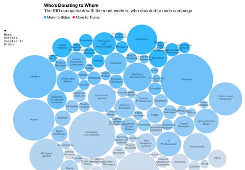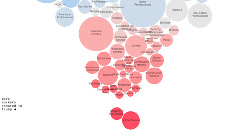 Și, în timp ce donatorii cei mai importanți ai lui Biden au fost avocați, profesori universitari, doctori, ingineri, cercetători, donatorii cei mai mari ai lui Trump au fost persoane cu handicap, gospodine, șoferi, muncitori în construcție, mecanici, farmaciști, instalatori.