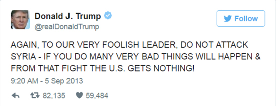 His Tweets following the 2013 alleged “sarin gas attack” reveal a different man, the non-interventionist Americans hoped they were voting for: