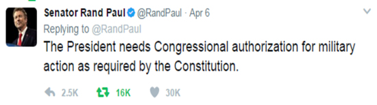 Here’s what Ron Paul’s son, Senator Rand Paul, Tweeted in response to Trump’s missile assault: