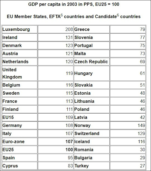 În anul 2004, Eurostat publica, pentru prima dată, un tabel comparativ între principalii indicatori de performanță, pentru anul 2003, ai statelor membre ale Uniunii Europene (pe atunci erau 25 de state membre). Indicatorul global de comparare a realității economice naționale a devenit, atunci, produsul intern brut/locuitor, la puterea de cumpărare standard (PIB/locuitor, metodologia PPS-purchasing power standard). Iată care era fotografia Uniunii de atunci, cu nivelul 100 fixat la media Uniunii Europene compusă din 25 de state: