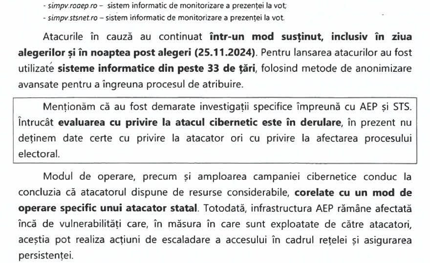 Notăm totuși nota absolut neutră și profesionistă a Serviciului de Telecomunicații Speciale, care contrazice întreaga narațiune indusă de celelalte servicii, afirmând că procesul electoral nu a fost perturbat de „actori cibernetici statali și non-statali” reiterând pe parcursul notei că „nu au fost identificate disfuncționalități” „nefiind sesizate anomalii”.