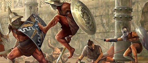 E ziua în amiaza mare la Roma, dar Soarele a apus deja, dincolo de uriaşul Colosseum, acoperind cu o umbră lungă, brăzdată cu ferestruici de lumină, străzile dimprejur. 60.000 de oameni luau parte, în vremurile de glorie ale Imperiului, la luptele de gladiatori şi la feluritele jocuri care precedau cel mai gustat spectacol al epocii antice. „Circ şi pâine!” Mai marii Romei plăteau fără să se uite la pungă, când era vorba să distreze poporul. Şi dacă pâinea nu era totdeauna îndestulătoare, „circul” trebuia să fie mereu la înălţime! Iar „vârful” lui erau luptele cu gladiatori. Începute ca un ritual de sacrificiu, pe vremea etruscilor, luptele în arenă ajung pe vremea lui Traian la rangul de mare spectacol, pe care numai sportul din vremea noastră l-ar putea concura. Ziua de jocuri începea cu reprezentaţii cu animale, aduse pe bani grei din junglele Africii şi Asiei, tigri, elefanţi, lei erau prezentaţi publicului avid de adrenalină, care umplea până la refuz gradenele celui mai mare amfiteatru al lumii antice. De-abia după-amiaza venea rândul gladiatorilor…