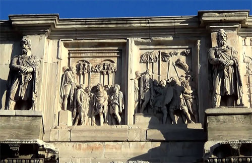 Construit în grabă, ca să sărbătorească o mare victorie a Împăratului Constantin cel Mare, arcul a fost placat cu lucrări realizate în epoci anterioare. Aşa se face că alte patru statui de daci, cu privirea aspră, scrutătoare, se găsesc în partea de sus a arcului. Interpretarea e aceeaşi, surprinzătoare. Dacii nu par prizonieri de război. Au demnitate, mândrie, sunt liberi, fără lanţuri pe ei, nişte bărbaţi frumoşi şi înţelepţi.