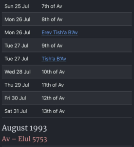 - Având în vedere diferențele dintre calendarul convențional gregorian și cel iudaic, care are doar 354 de zile dar este ajustat periodic cu o lună, Tisha B’Av este comemorată anual în zile diferite în lunile iulie și august. 11 septembrie 2001 este o Tisha B’Av din punct de vedere terminologic și numerologic – 9/11 nu și religios, comemorarea religioasă a Tisha B’Av din 2001 având loc pe 28-29 iulie 2001.