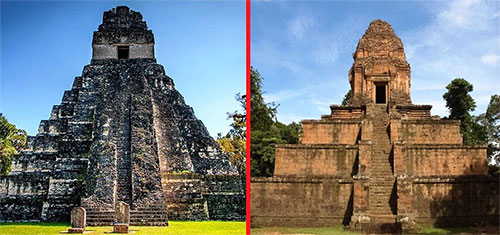 Una dintre cele mai fascinante asemănări de acest fel este aceea dintre un templu din Siem Reap, Cambodgia de nord-vest (Asia), și o piramidă-templu aflată în Guatemala (America centrală), la o distanță de 14.000 de kilometri. Printre impresionantele ruine de la Angkor Wat se află și vechiul templu Baksei Chamkrong, despre care istoricii spun că a fost construit în secolul X după Hristos.