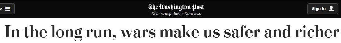 Iar mass-media corporatistă, prin omisiune, jumătăți de adevăr și minciuni, promovează războiul ca pe o tentativă de a obține pacea. În cuvintele Washington Post, „războiul ne face mai siguri și mai bogați”.