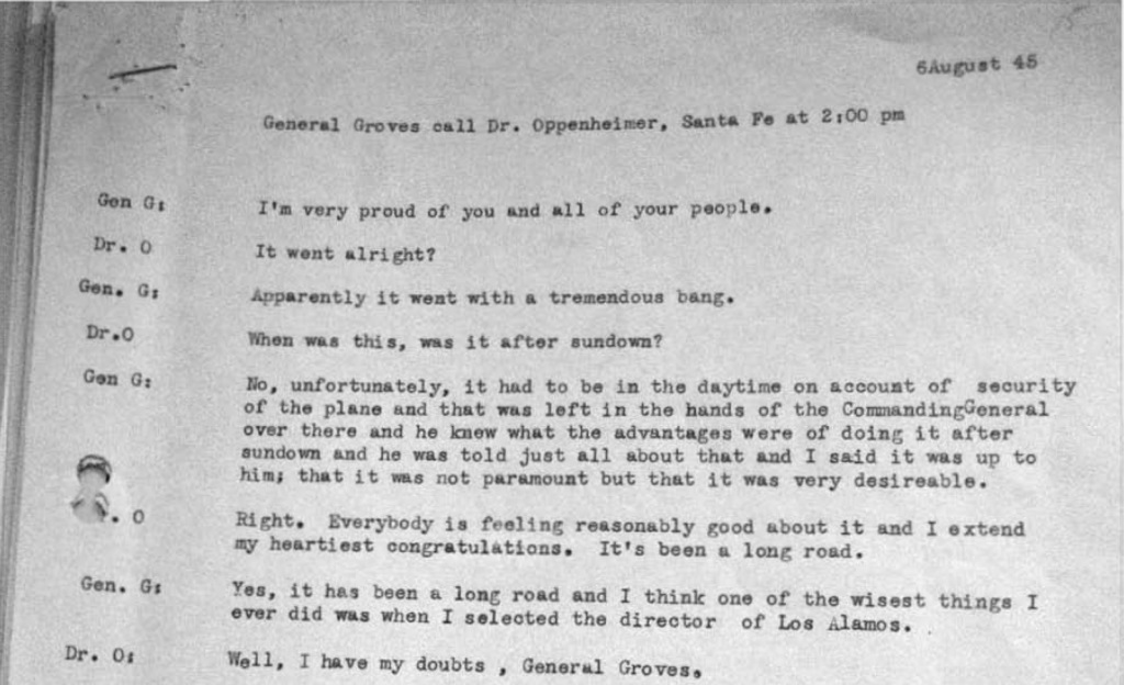 Redăm mai jos transcrierea unei convorbiri telefonice din 6 august 1945, desecretizată, între generalul Groves și dr. Oppenheimer, la câteva ore după bombardamentul de la Hiroshima: