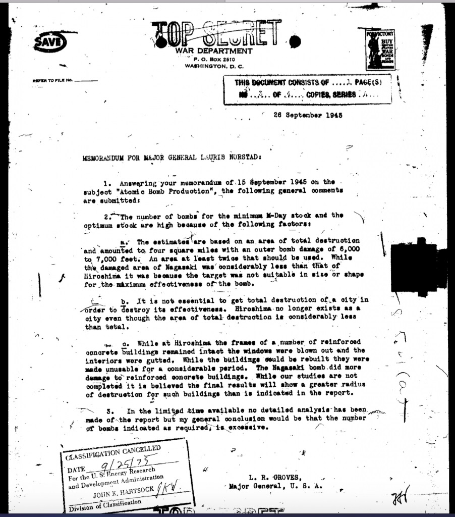 Generalul-locotenent Groves, fără îndoială în urma consultării cu dr. Oppenheimer, i-a răspuns generalului-maior Norstad într-un memorandum din 29 septembrie 1945, în care se referă la Hiroshima și Nagasaki.