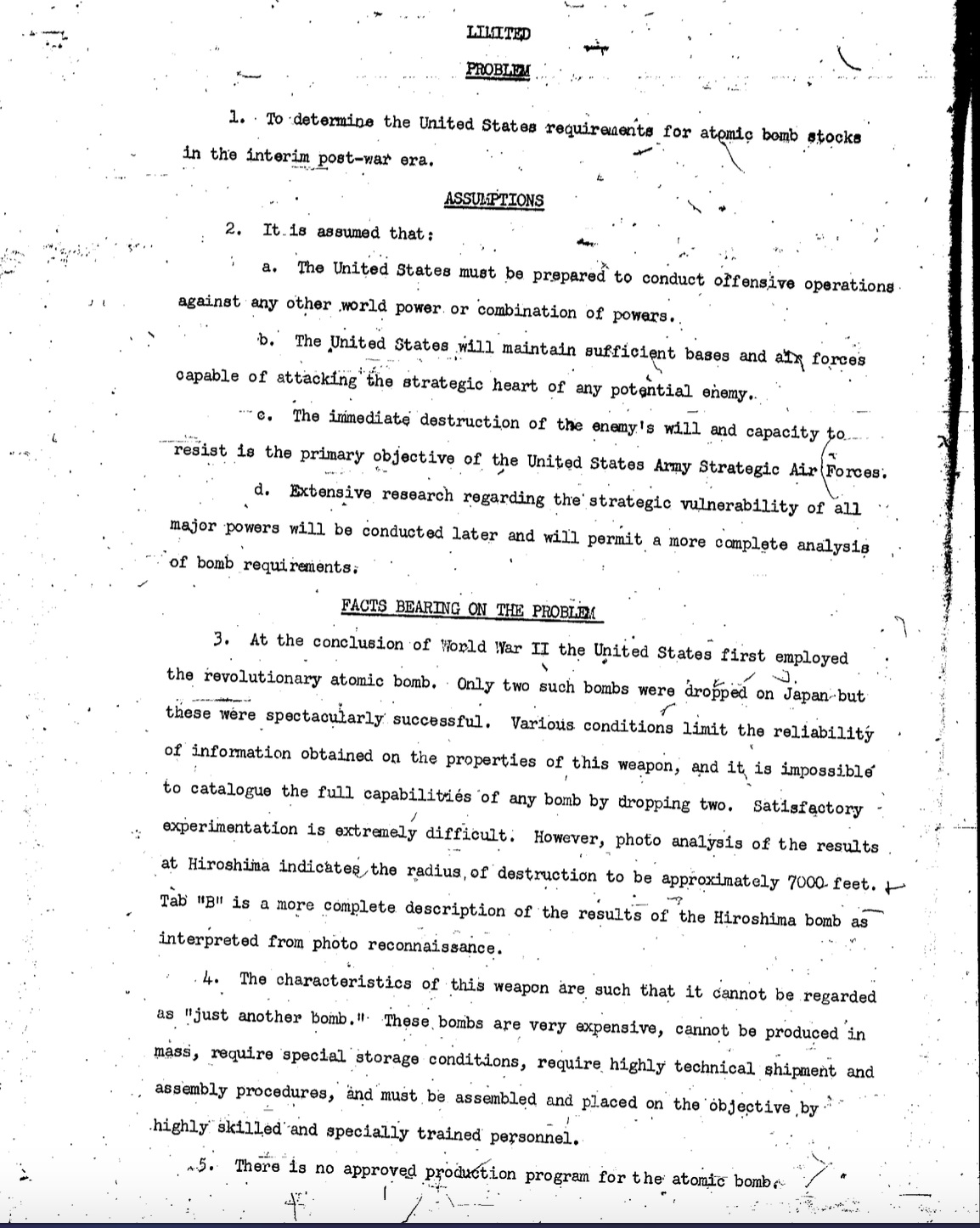 La 15 septembrie 1945, Norstad i-a trimis un memorandum lui Leslie Groves prin care solicita o estimare a „numărului de bombe necesare pentru a ne asigura securitatea națională” (Primele cerințe de stocare atomică)