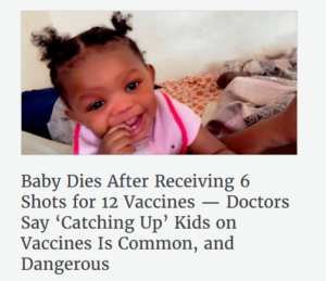 Conform childrenshealthdefense.org, la aproximativ 12 ore după ce Sa’Niya, în vârstă de 1 an, a primit șase doze pentru 12 vaccinuri în timpul unei vizite medicale, fetița a murit. Sa’Niya a primit vaccinurile pe 26 martie la Golisano Children’s Hospital Pediatric Practice din Rochester, New York, potrivit mamei copilului, Shanticia Nelson.