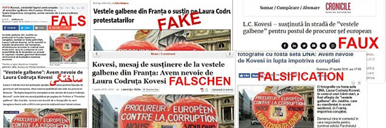În România, campania de susținere a lui Kovesi a fost marcată de momente de manipulare halucinante. Un astfel de exemplu a fost știrea falsă grosolană – propagată de altfel pe canale de știri care susțin sus și tare că luptă împotriva fenomenului fake news – conform căreia mișcarea Vestelor galbene din Franța ar susține candidatura Laurei Codruța Kovesi.