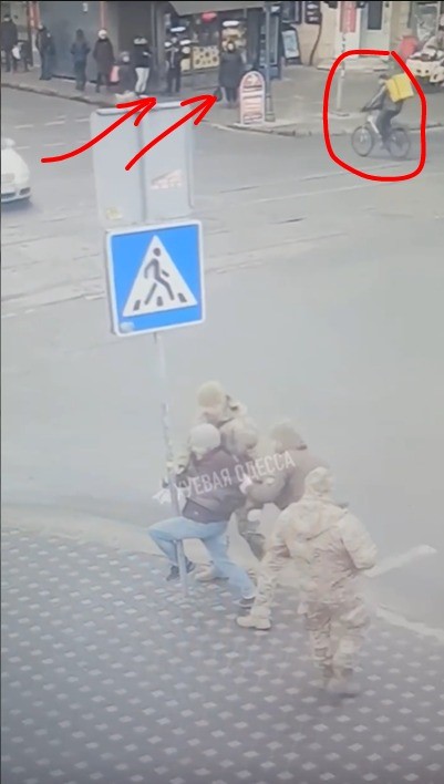 Uitați-vă la instantaneul de mai jos, pe care l-am extras dintr-un recent filmuleț: oamenii se uită idiotizați cum este luat cu forța de pe stradă semenul lor, dar nimeni nu intervine. Gig economy își vede de treabă în continuare: în timp ce un ucrainean se pregătește să meargă la tocător în Bahmut, altul cară ciorbițe cu Glovo. În continuarea filmulețului se văd trecând mașini, oameni pe stradă. Unii nici nu întorc capul, se fac că nu văd. Nimeni nu intervine să le ardă o lopată în cap brutelor lui Zelenski. Fiecare e cu treaba lui.