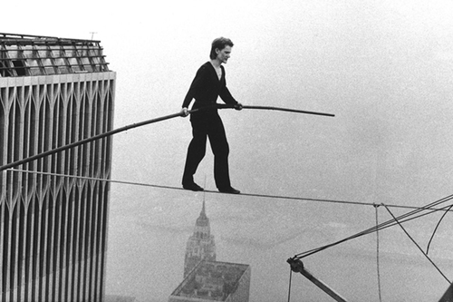 Am locuit treizeci de ani la New York. Îmi amintesc de un fapt petrecut în vara anului 1974. Mă duceam cu un desen la Wall Street Journal, care se afla pe atunci în World Trade Plaza și, când am ieșit de la metrou, mi-a atras atenția mulțimea oprită ca să privească undeva în sus. Circulația era paralizată, oamenii păreau încleiați în asfalt, încremeniți cu capul pe spate, privind spre cer. Am ridicat și eu ochii și am văzut un cablu întins între cele două turnuri gemene, astăzi dispărute, pe care un om, o gâgâlice la 400 de metri deasupra pământului, mergea în echilibru, ținând în mâini o prăjină. Acolo sus, chiar în zilele aparent calme, vântul suflă cu 10 km pe oră. Spectatorii, de obicei trecători grăbiți în cartierul afacerilor mondiale, așteptau cu sufletul la gură să vadă dacă temerarul va reuși sau se va prăbuși, zdrobindu-se de asfalt.